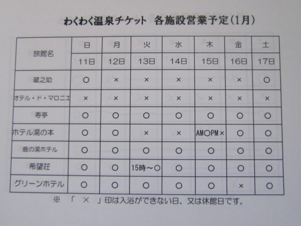 わくわく温泉チケット休館日(1/11~1/17)